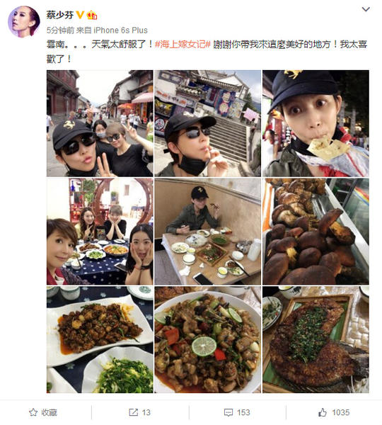 今日(7月15日)下午,“皇后娘娘”蔡少芬在微博上传一组在云南拍戏间隙游玩的照片,并写道:“云南天气太舒服了!#海上嫁女记# 谢谢你带我来这么美好的地方!我太喜欢了!”照片中,蔡少芬变身“吃货”,不仅大秀云南美食,还一路吃吃吃不停。